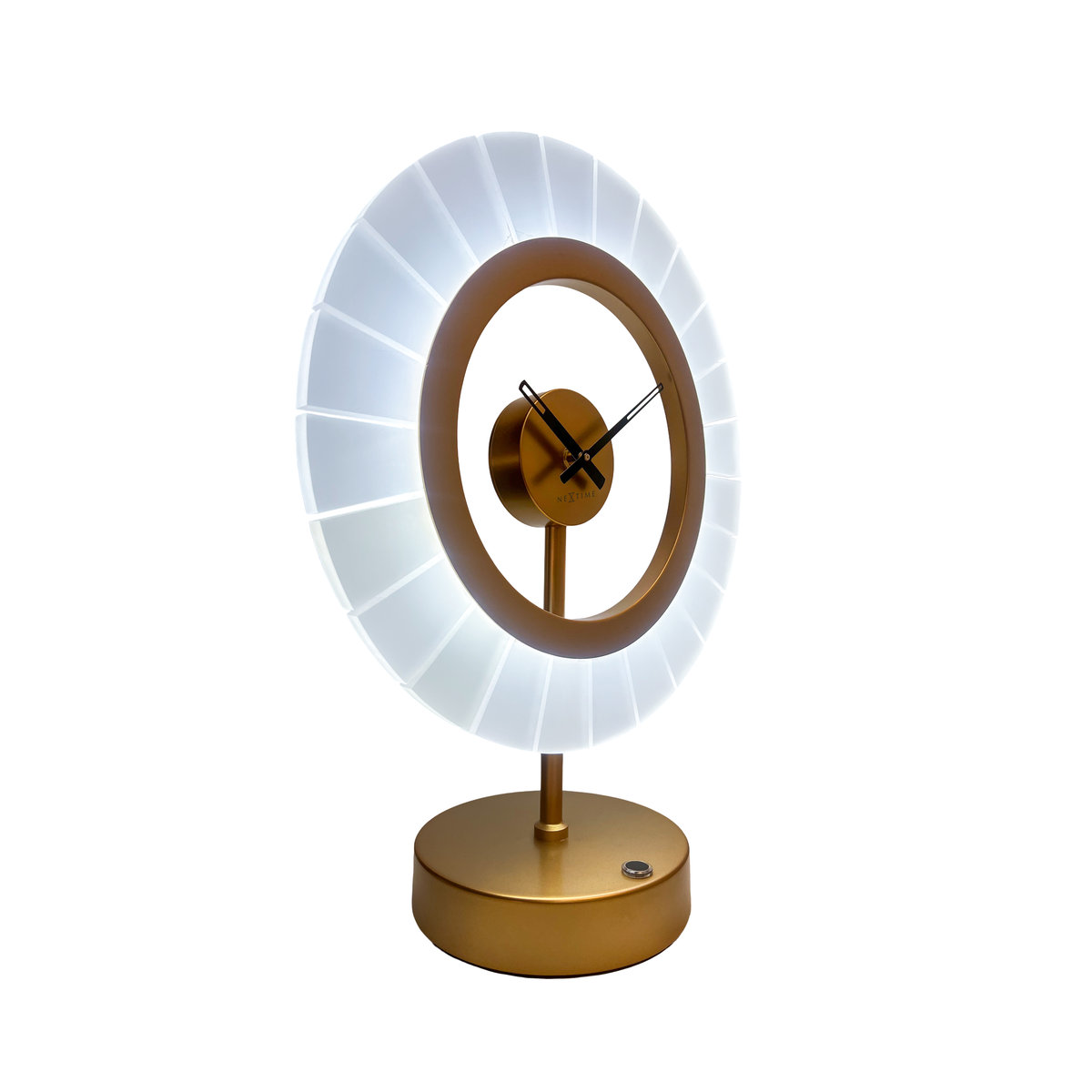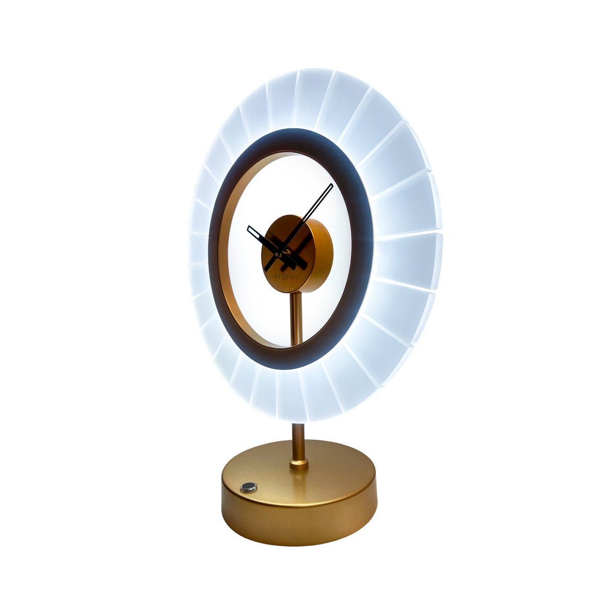 Zegar z lampą LC4001 CG „Ting’, wyposażony jest w cichy mechanizm zasilany za pomocą baterii typu AA. Zegar wykonany z akrylu i metalu w kolorze szampańskieo złota. Jego wymiary to: 33 × 16 × 42 cm.