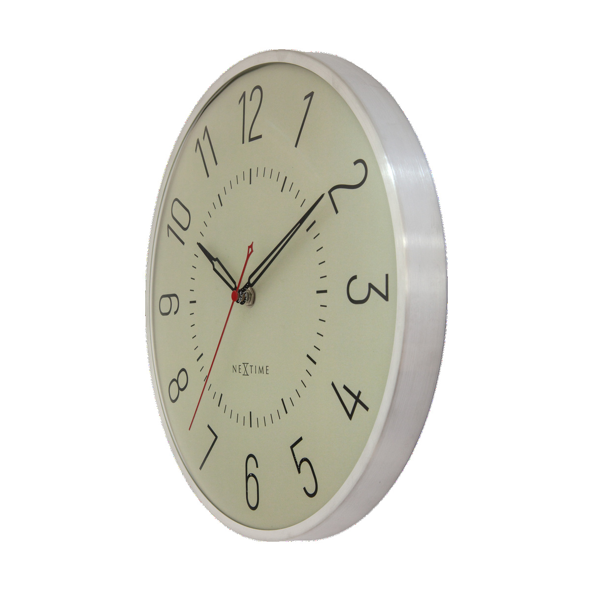 Zegar wyposażony jest w cienką aluminiową obudowę oraz lekko wypukłe szkło, które nadają mu lekki i nowoczesny charakter. Delikatna kolorystyka tarczy – dostępna w odcieniu miękkiej zieleni lub złamanej bieli – tworzy subtelny, a jednocześnie wyrazisty akcent na ścianie.